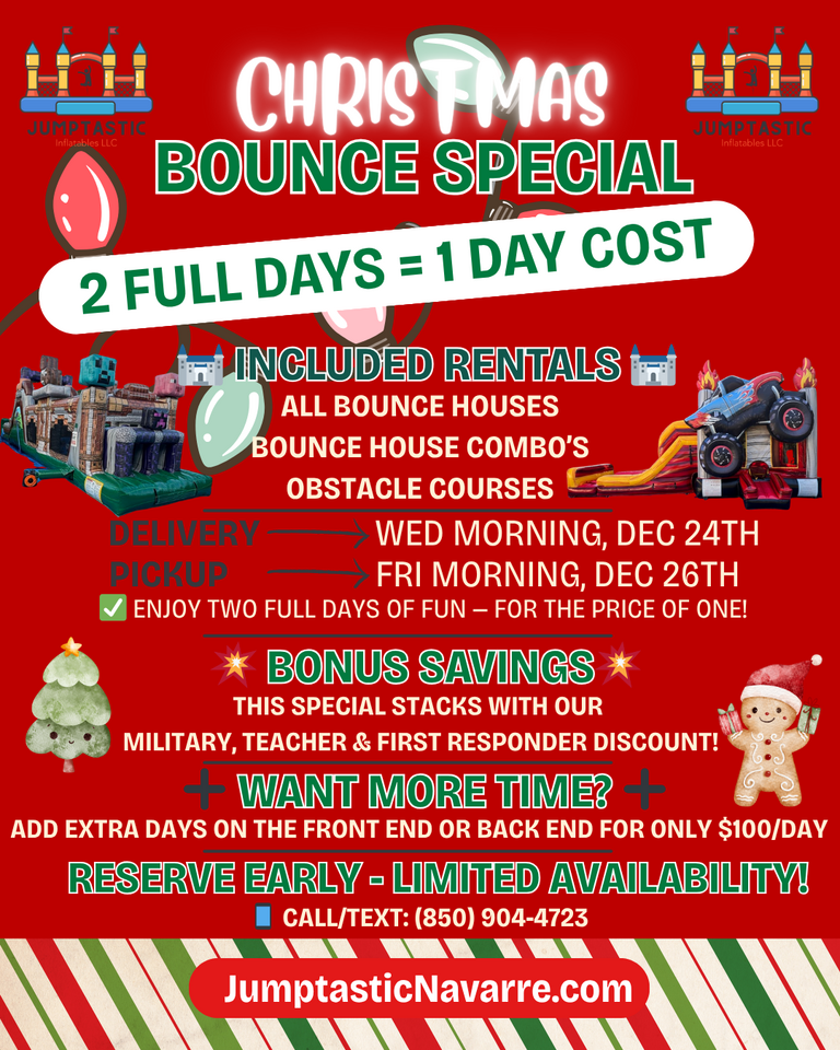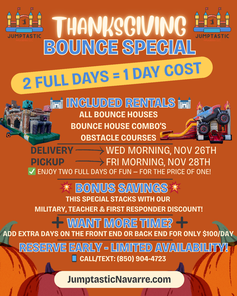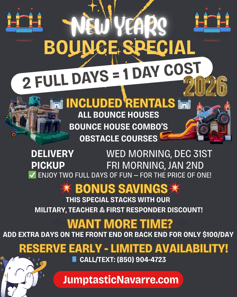 At Jumptastic Navarre, we’re turning our Air Force Reserve drill weekends into a win for your family! As proud Reservists, Jess & Steven sometimes have limited availability for deliveries—but instead of shutting down, we’re opening up a Drill Weekend Special you won't want to miss!
